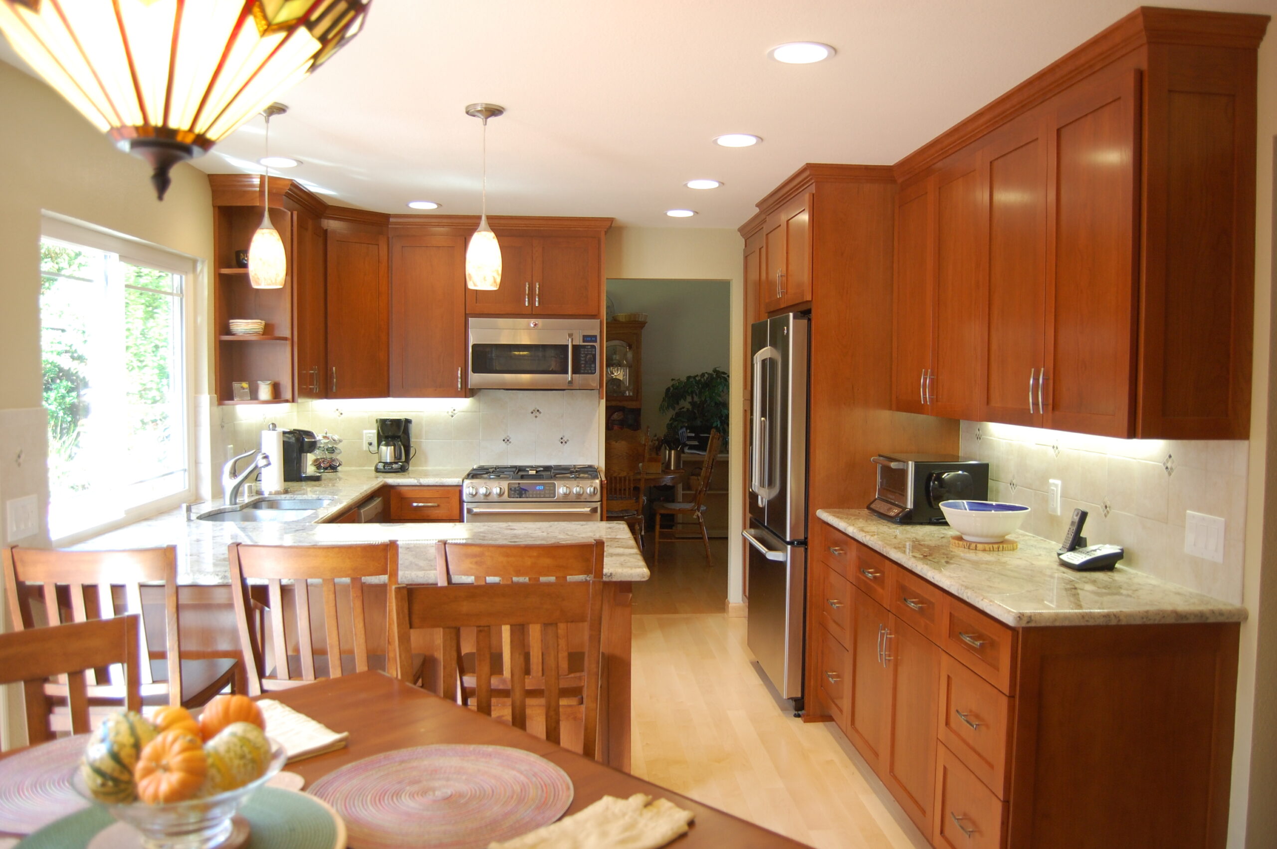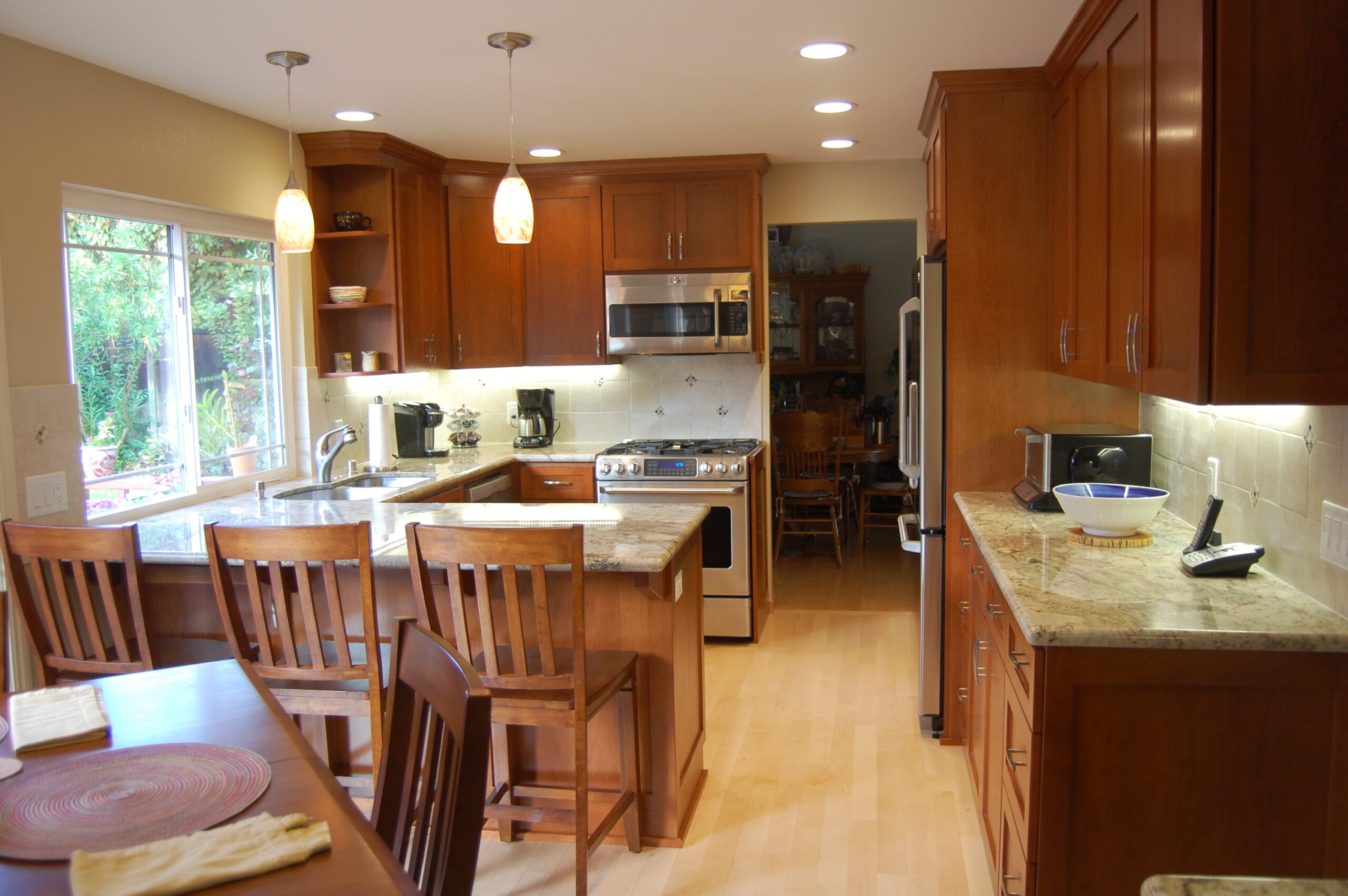 Picture 3: This Almaden kitchen features pendant lights suspended over the cherry and granite peninsula.