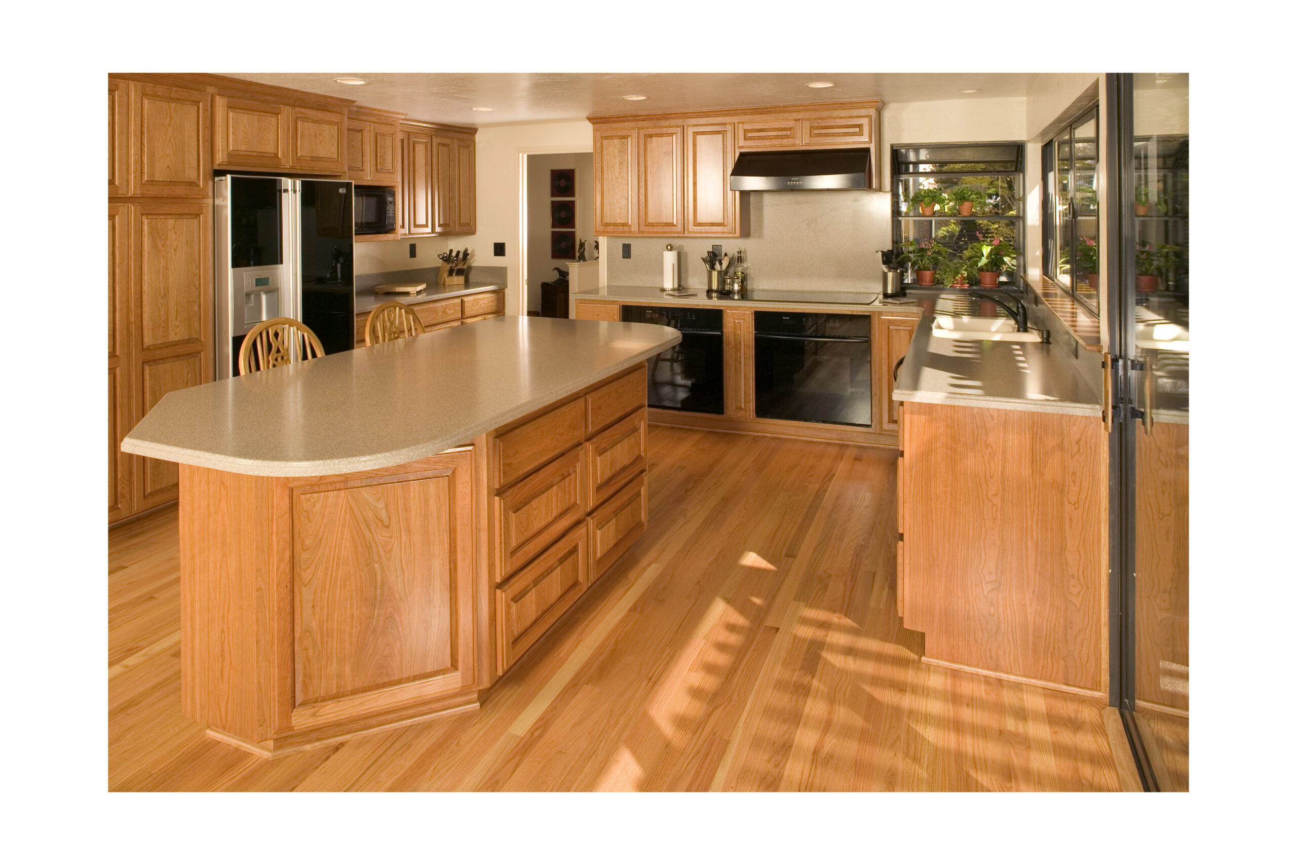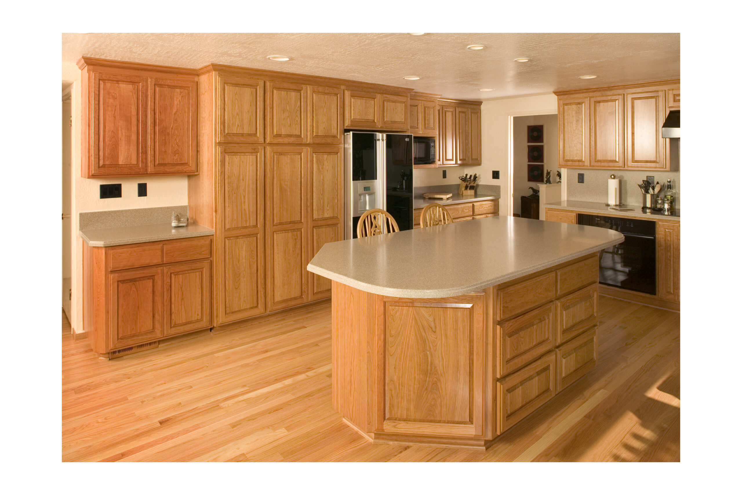 Picture 3: A large island with cherry cabinets and Corian counter tops creates valuable storage space, and bar seating options.