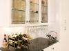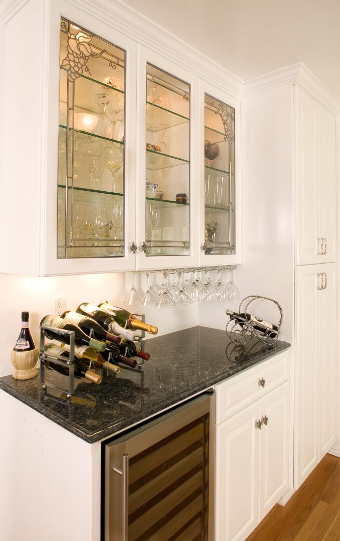 Picture 2: White cabinets and glass cabinet doors offset dark granite counter tops on this modern bar. A stainless steel wine cooler installed underneath the bar top and glassware racks hanging from upper cabinets lend to its elegant feel.